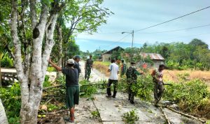 Mengantisipasi pohon tumbang yang diakibatkan angin kencang Anggota Koramil 1208-02/Sejangkung Serda Firmansyah bersama Anggota Babinsa lainnya dan warga Desa Setalik melaksanakan Kegiatan Gotong Royong pemangkasan dahan pohon di kiri kanan sepanjang jalan Dusun Nelayan Desa Setalik Kec.