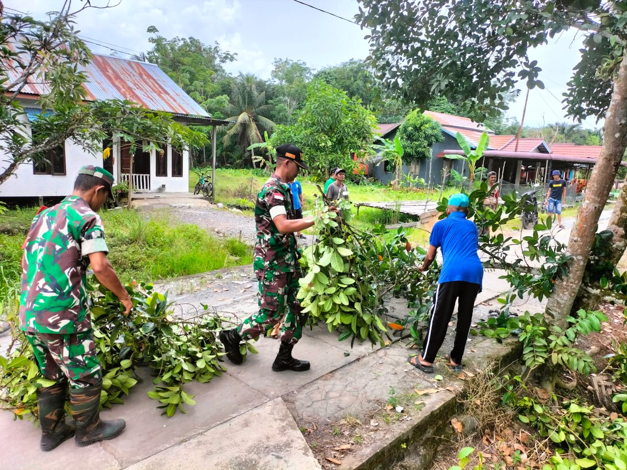 Mengantisipasi pohon tumbang yang diakibatkan angin kencang Anggota Koramil 1208-02/Sejangkung Serda Firmansyah bersama Anggota Babinsa lainnya dan warga Desa Setalik melaksanakan Kegiatan Gotong Royong pemangkasan dahan pohon di kiri kanan sepanjang jalan Dusun Nelayan Desa Setalik Kec.