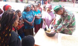 Satgas Satuan Organik Yonif Raider 301/PKS Bekali Warga Distrik Ilu Kabupaten Puncak Jaya-Papua pengetahuan tentang cara mengolah bahan makanan yaitu kacang kedelai menjadi tempe.