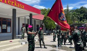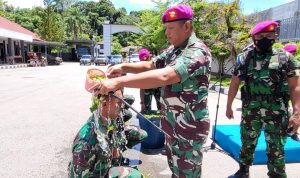 Sorong Papua Barat – Komandan Batalyon Marinir Pertahanan Pangkalan (Danyonmarhanlan) XIV Sorong Letkol Marinir Oktofiansyah Rahman memimpin upacara tradisi penerimaan prajurit remaja Yonmarhanlan XIV TA. 2022 di lapangan apel Yonmarhanlan XIV, Kota Sorong, Papua Barat. Kamis (22/09/2022).