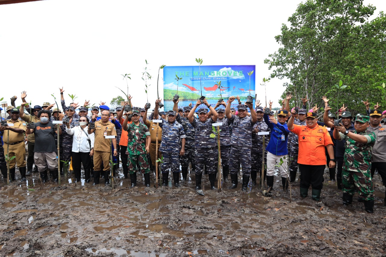 Panglima Komando Armada III, Laksamana Muda TNI Irvansyah didampingi Komandan Lantamal XIV, Laksamana Pertama TNI Imam Musani memimpin penanaman bibit pohon Mangrove di wilayah Sorong, diikuti tamu undangan dari Forkopimda dan prajurit TNI AL.