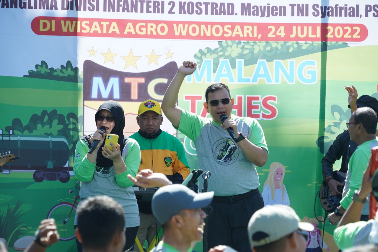 Dalam rangka menjaga kebugaran tubuh untuk kesehatan, Pangdivif 2 Kostrad Mayjen TNI Syafrial, PSC., M.Tr.(Han)., didampingi oleh Ibu Ketua Persit KCK Divif 2 PG Kostrad, Ibu Shinta Syafrial bersama MTC (Malang Tahes Club) dengan Forkopimda Malang Raya melaksanakan jalan sehat di daerah Kebun Teh Wonosari PTPN XII, Ds. Bodean Puthuk Toyomarto, Kec. Singosari, Kab. Malang, Jawa Timur, pada Minggu pagi. (24/07).