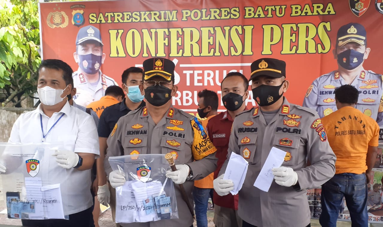 Kapolres Batu Bara AKBP Ikhwan Lubis didampingi Kasat Reskrim AKP Fery Kusnadi menggelar press release kasus penyelundupan 31 calon TKI ke Malaysia, Selasa (27/4/2021).