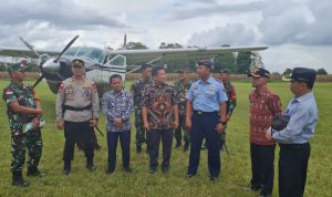Komandan Lanud Harry Hadisoemantri Letkol Nav W.P.Pujo Wahono, SH.,M.Han. meninjau saat uji coba Landing dan Takeoff pesawat Cassa C208B di Runway Lanud Harry Hadisoemantri, Sanggau Ledo, Kalimatan Barat, Kamis (05/08/2022).