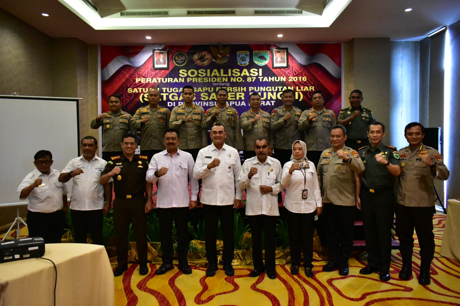 Sorong Papua barat – Kapolres Sorong kota AKBP Johannes Kindangen S.Ik , M.Si menghadiri Kegiatan Sosialisasi Peraturan Presiden No.87 Tahun 2016 Tentang Satuan Tugas Sapu Bersih Pungutan Liar (Saber Pungli) di wilayah Provinsi Papua Barat (Sorong Raya) Oleh Kementerian Koordinator Bidang Politik, Hukum dan Keamanan Republik Indonesia,(Irjen Pol Drs. Rudolf Alberth Rodja),yang bertempat di Ball Room Swiss Bel Hotel Jalan Jendral Sudirman Kelurahan Malawei Distrik.Sorong Manoi Kota Sorong Provinsi Papua Barat. (13/10/2022)