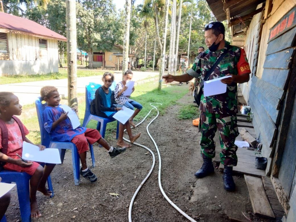 Pengentasan Buta Aksara, Babinsa Koramil 1802-03/Salawati. Serma Suparmin mengajar anak anak menulis dan membaca bertempat di Balai Kampung Walal Distrik Salawati Kabupaten Sorong Papua barat. Jumat, (17/06/2022).