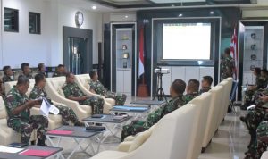 Panglima Koarmada III/ Pangkoarmada III Laksamana Muda TNI Irvansyah S.H., CHRMP., M. Tr.Opsla menerima paparan Rencana Garis Besar Latihan Geladi Tugas Tempur TK. III/L-3 dari Komandan Satuan Kapal Cepat Koarmada III Kolonel Laut (P) Yudhoko Timuryanto di Pasific Room Mako Koarmada III, Katapop Kabupaten Sorong Papua Barat. Selasa (28/06/22).