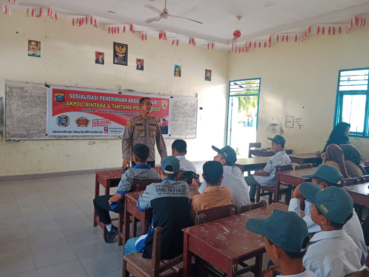 Penerimaan Anggota Polri Tahun 2023 Kapolsek Labuhan Ruku AKP Ferry Kusnadi.SH.MH yang didampingi Kanit Binmas Iptu Ahmad Fahmi.SH, secara langsung bersosialisasi di SMK Sepakat yang terletak di Jalan Perintis Kemerdekaan, Dusun V, Desa Sei Balai, Kecamatan. Sei Balai, Kabupaten. Batu Bara. 31 Maret 2023 Pukul 13 : 30 wib.