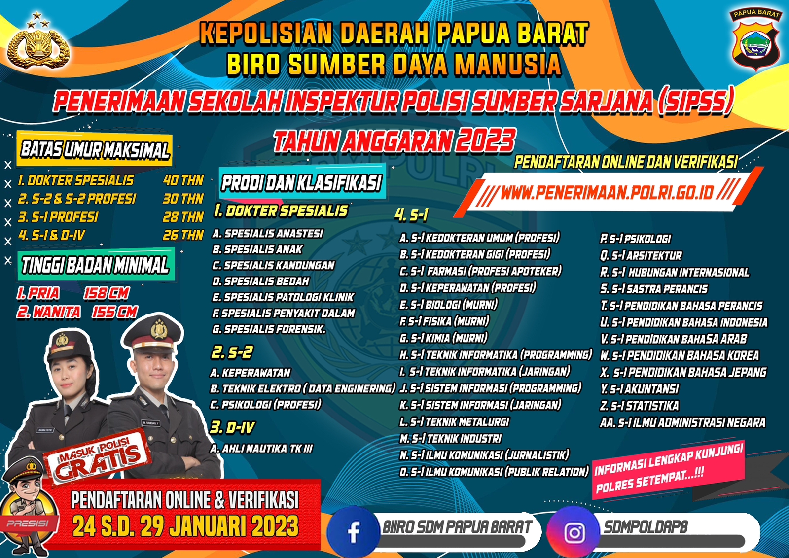 Iya Polda Papua Barat telah membuka penerimaan Polri melalui jalur Sekolah Inspektur Polisi Sumber Sarjana (SIPSS). Bagi saudara/saudari Papua Barat yanh ingin mendaftar bisa melakukan pendaftaran yang dibuka pada 24 Januari dan akan ditutup pada 29 Januari 2023″ujar Karo SDM.