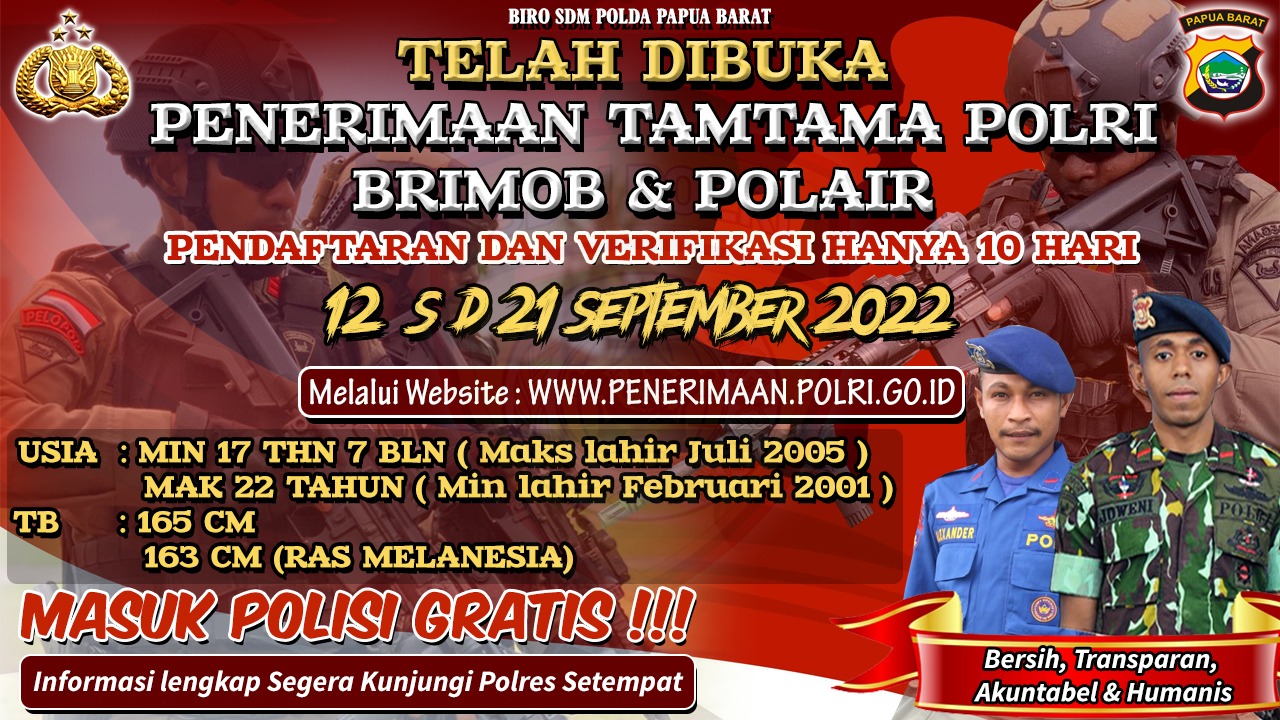Manokwari Papua Barat – Kepolisian Daerah Papua Barat hari ini telah membuka penerimaan Tamtama Polri T.A. 2022, pendaftaran ini mulai tanggal 12 September 2022 dan ditutup tanggal 21 September 2022.