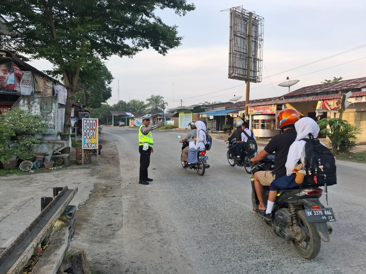 Jaga kelancaran arus lalu lintas jalan, kembali Personil Sat Lantas Polres Batu Bara berikan pengaturan di beberapa titik lokasi ramai lalu lalang siswa/i yang akan berangkat ke sekolah. 07.00 wib.