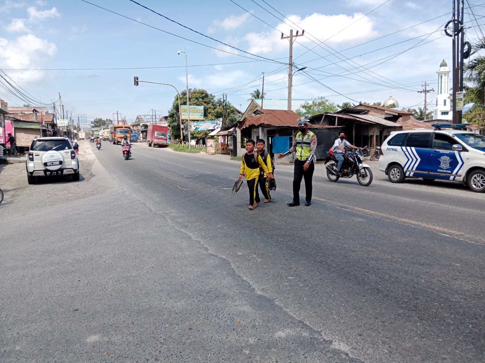 Tak luput dari perhatian,para Personil juga membantu anak sekolah yang ingin menyeberang jalan,sembari menyeberang anak salah seorang anak sekolah mengucapkan terimakasih kepada para Personil yang bertugas.