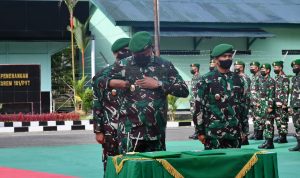 Danrem 181/PVT Brigjen TNI Indra Heri memimpin upacara dalam rangka laporan Korps Serah Terima Jabatan dan Tradisi Satuan Kepala Staf Korem, Kasi Intel dan Kasi Log Kasrem 181/PVT bertempat di Lapangan Sasana Kusuma Bangsa (SKB) Korem 181/PVT Jl. Pramuka No.01, Sorong, Papua Barat. Senin, (31/01/2022).