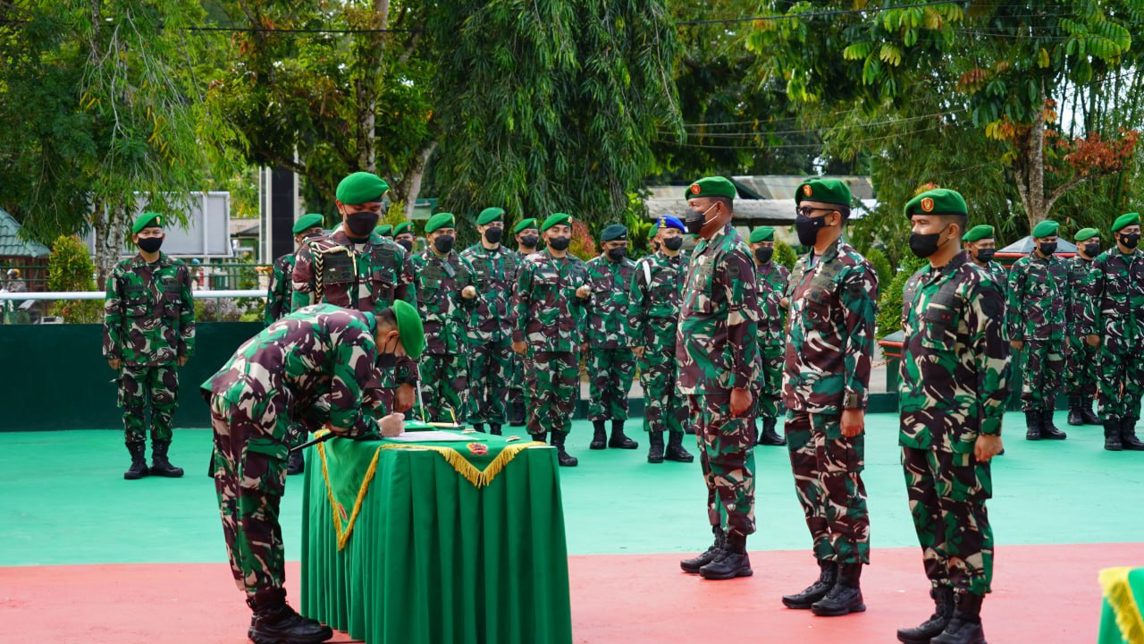 Danrem 181/PVT Brigjen TNI Indra Heri memimpin upacara dalam rangka laporan Korps Serah Terima Jabatan dan Tradisi Satuan Kepala Staf Korem, Kasi Intel dan Kasi Log Kasrem 181/PVT bertempat di Lapangan Sasana Kusuma Bangsa (SKB) Korem 181/PVT Jl. Pramuka No.01, Sorong, Papua Barat. Senin, (31/01/2022).