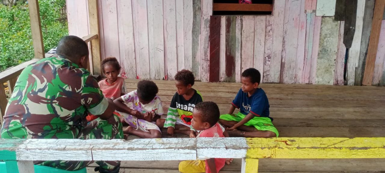 Babinsa Koramil 1802-02/Sorong Barat. Serda Tomas Yembise melaksanakan Giat Belajar mengenal huruf dan membaca kepada 13 anak anak di Rumah Pintar Komplek Kokoda Kelurahan Klawasi Distrik Sorong Barat. Rabu, (13/07/2022).